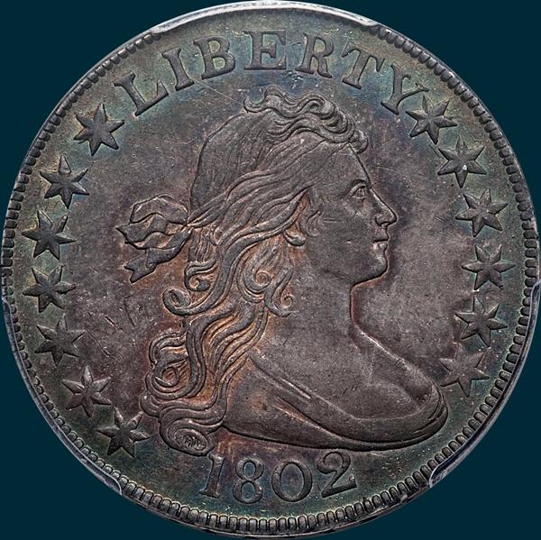 There was just one die marriage used during 1802, producing 29,820 pieces, where there are likely 300-400 survivors remaining. Most grade VF or below, with the few remaining higher grades commanding huge premiums.