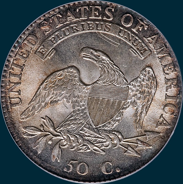 Reverse- 50 C. is 2 1/4 mm. and low. Arrow to A is 1/2 mm. Center dot between crossbars 5 and 6 at left. All crossbars except bottom one, show to right of shield. Serif of A clearly higher than serif of M where they join. Dot above top of left wing. This is the LDS with a die crack from base of D through the bases of S and T.